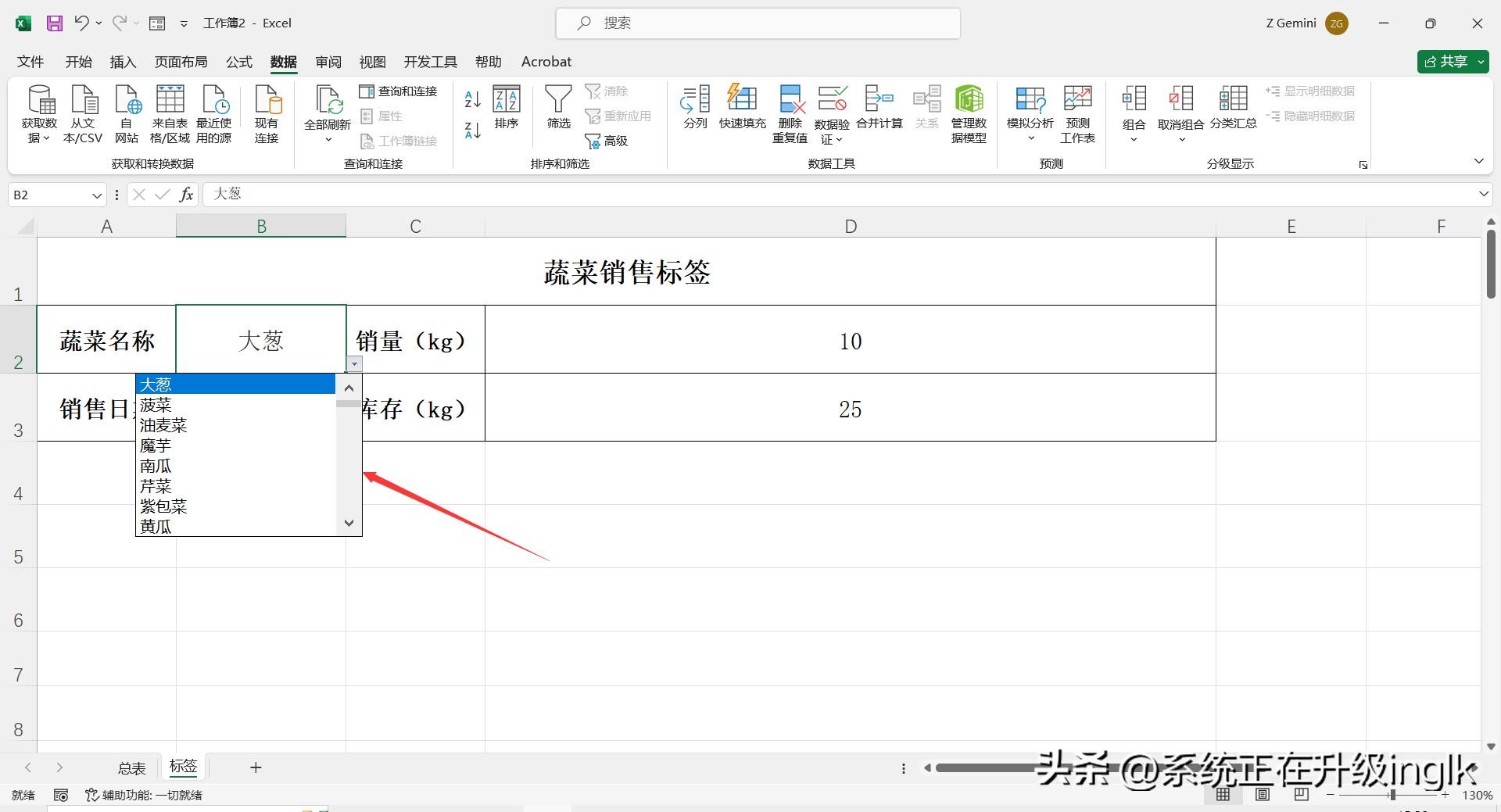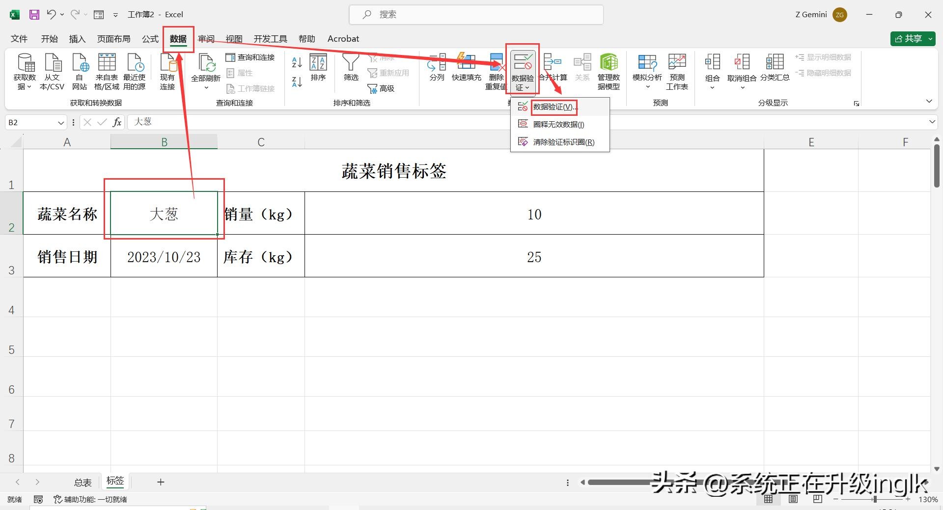 4、复制标签模版中“销量”的公式,依次粘贴到标签模版其他项目中,然后选中标签模版中第一个项目“蔬菜名称”内容单元格,点击【数据】-【数据验证】-【数据验证】,打开“数据验证”对话框。