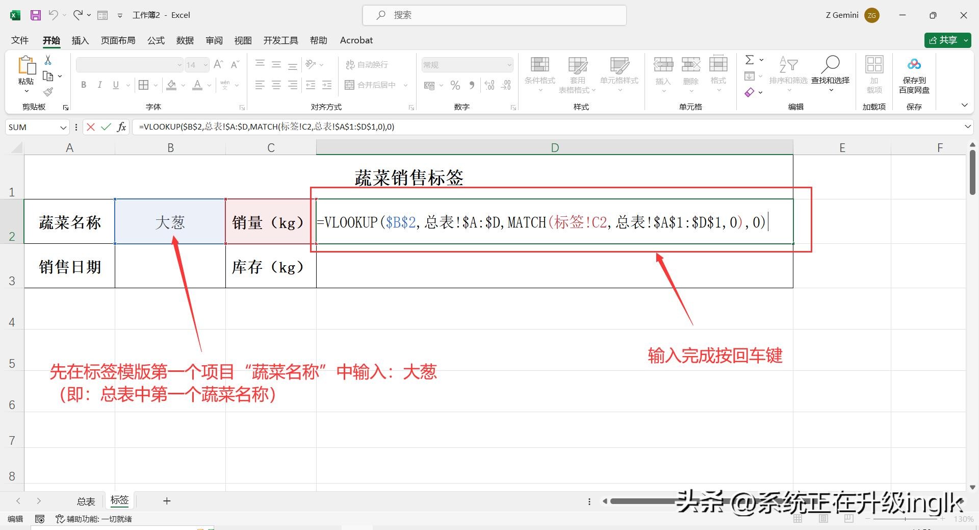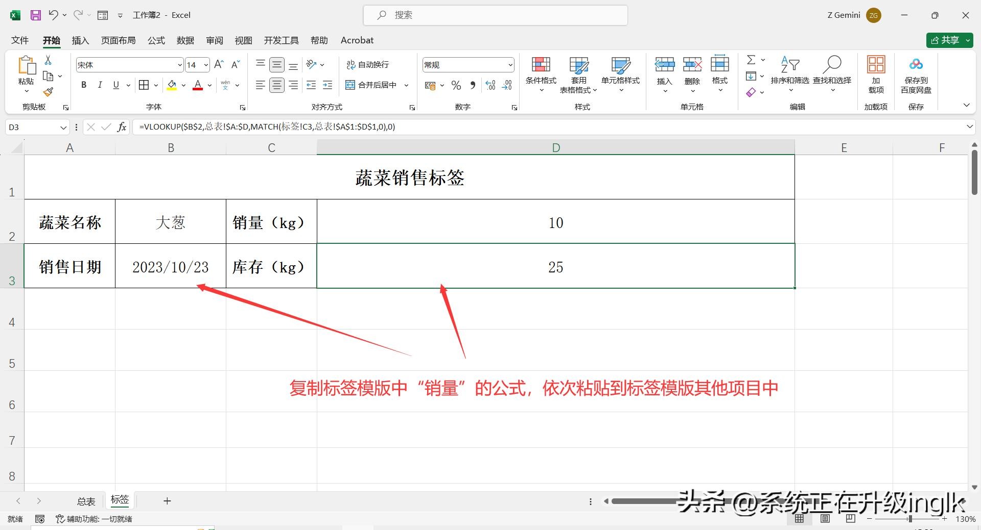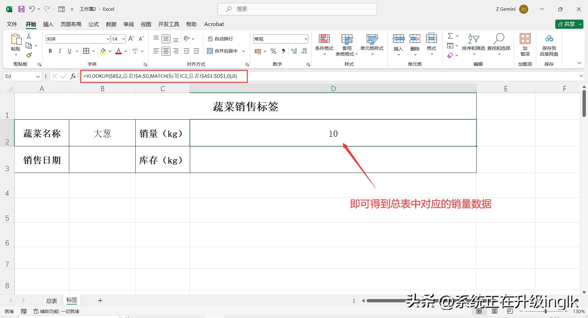 2、在“标签”工作表界面,先在标签模版第一个项目“蔬菜名称”中输入:大葱(即:总表中第一个蔬菜名称),然后再下一个项目“销量(kg)”中输入公式函数:=VLOOKUP($B$2,总表!$A:$D,MATCH(标签!C2,总表!$A$1:$D$1,0),0),输入完成按回车键,即可得到对应的销量数据。