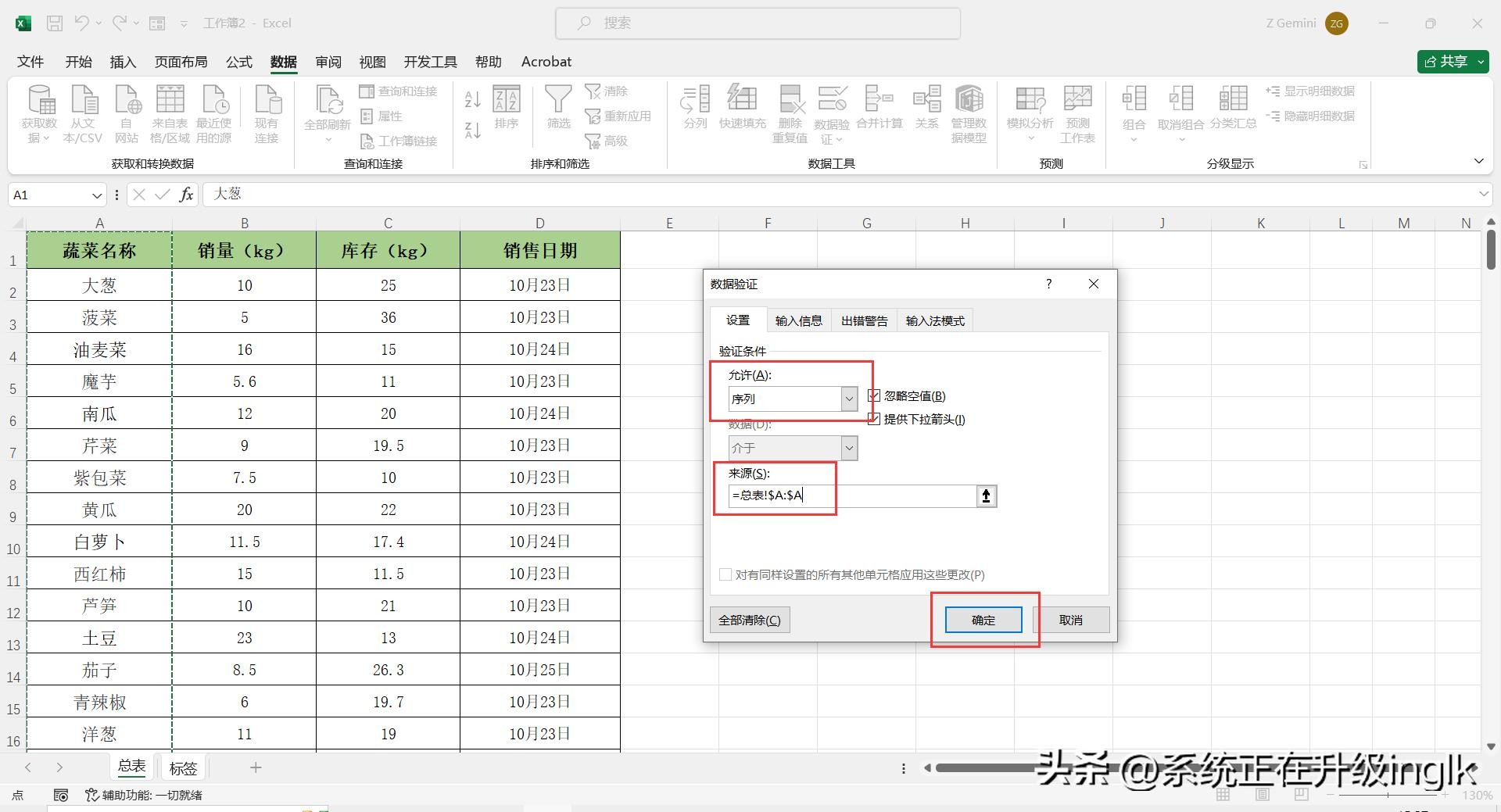 5、在“数据验证”对话框中,点击【设置】,将“允许”选择为:序列;“来源”拾取为:=总表!$A:$A,然后点击【确定】即可。这样就给模版标签中“蔬菜名称”项目设置了一个下拉菜单。