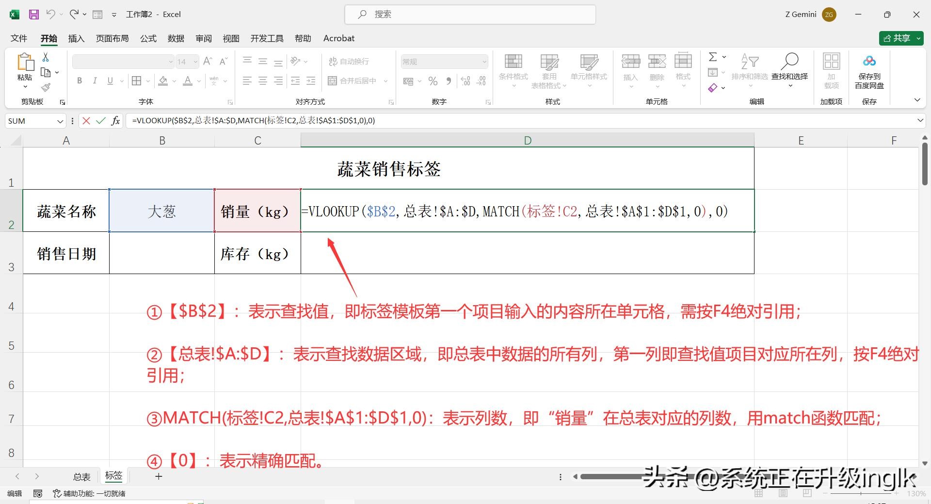 ③MATCH(标签!C2,总表!$A$1:$D$1,0):表示列数,即“销量”在总表对应的列数,用match函数匹配;