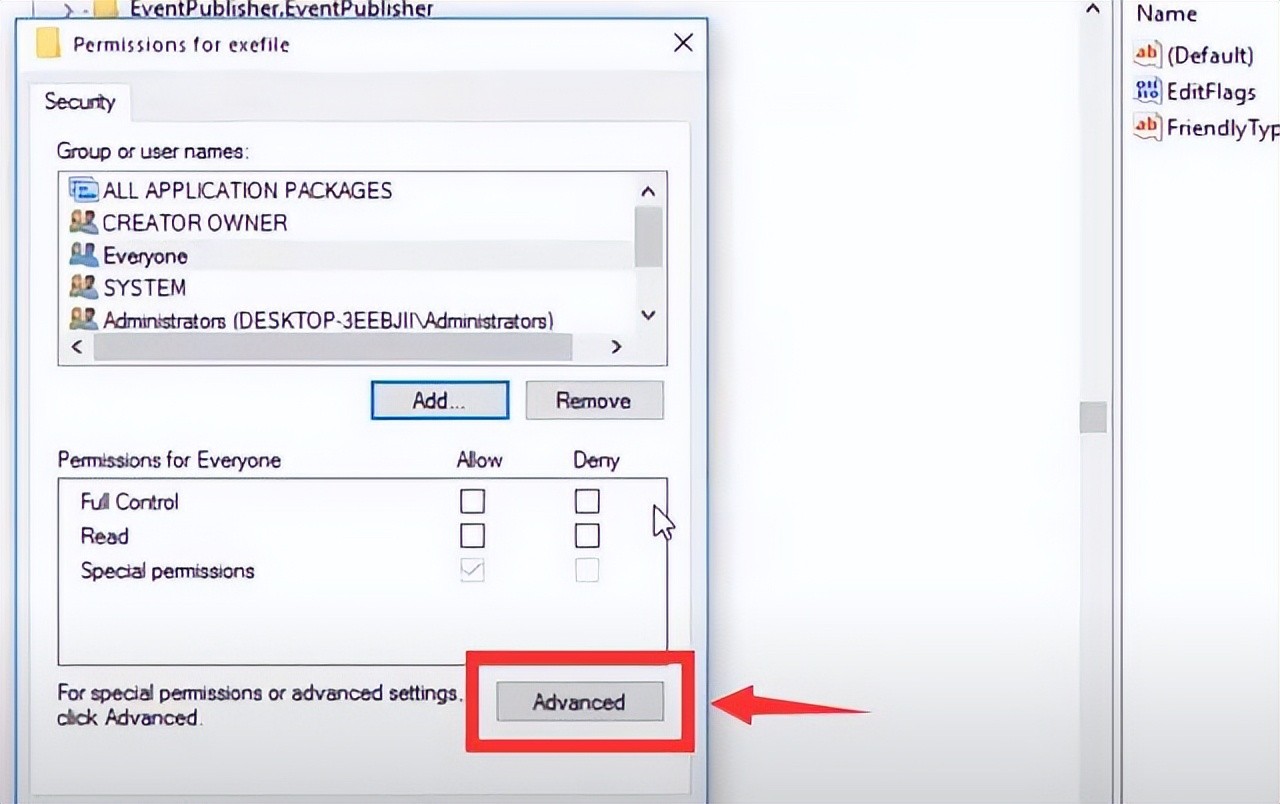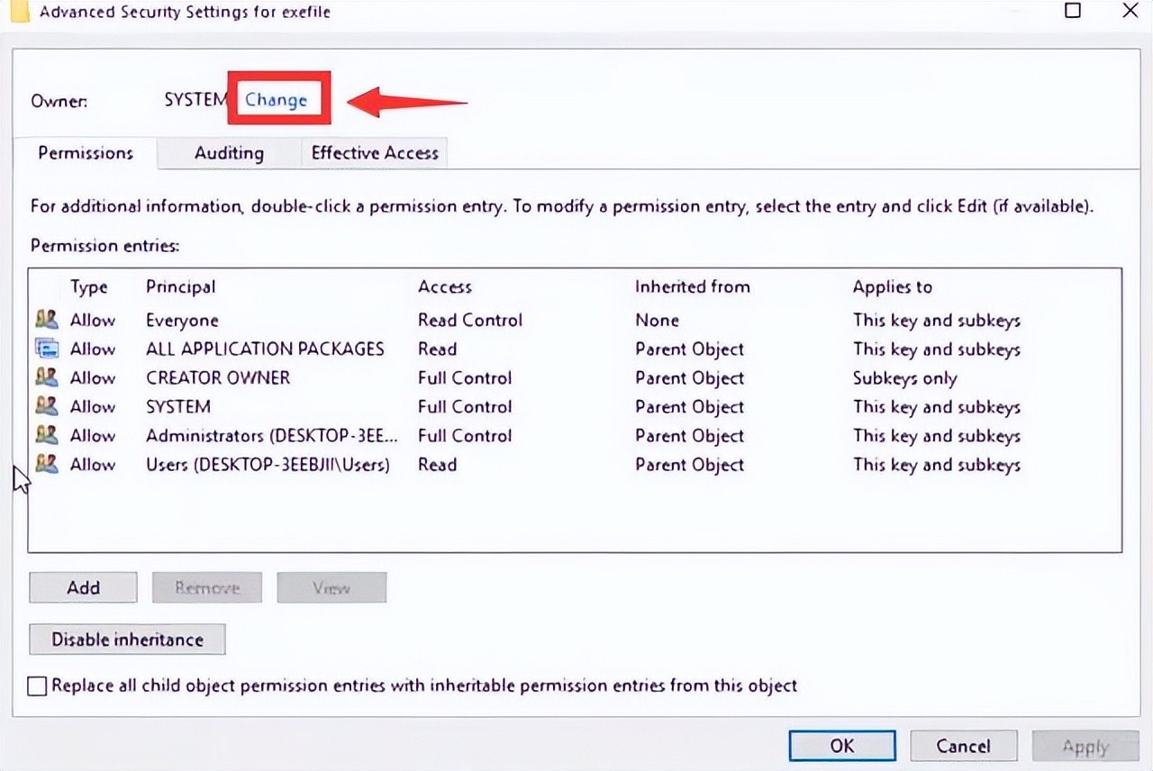 3.第三步:在权限对话框中点击“高级(Advanced)”,点击高级设置顶部的“更改(Change)”。