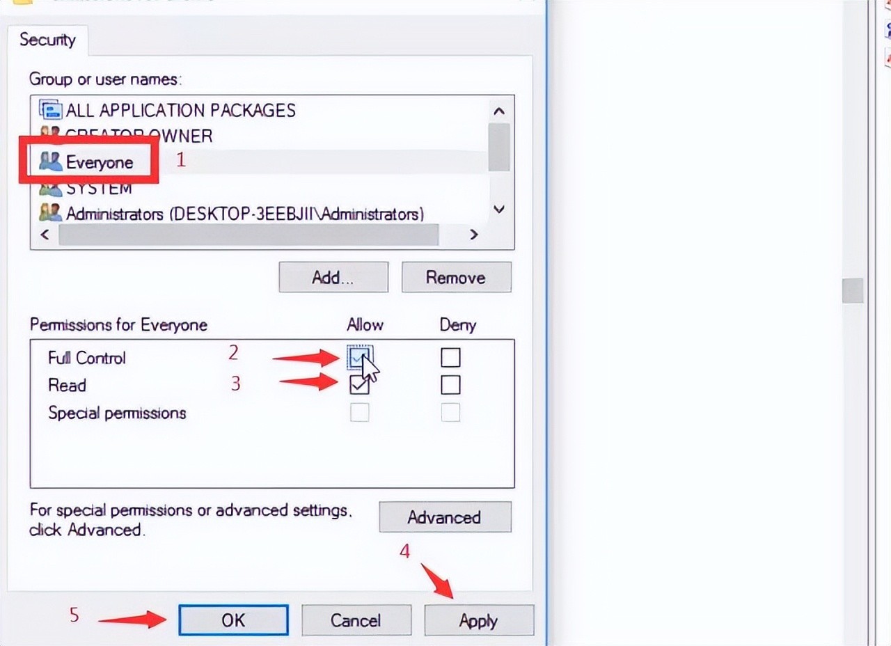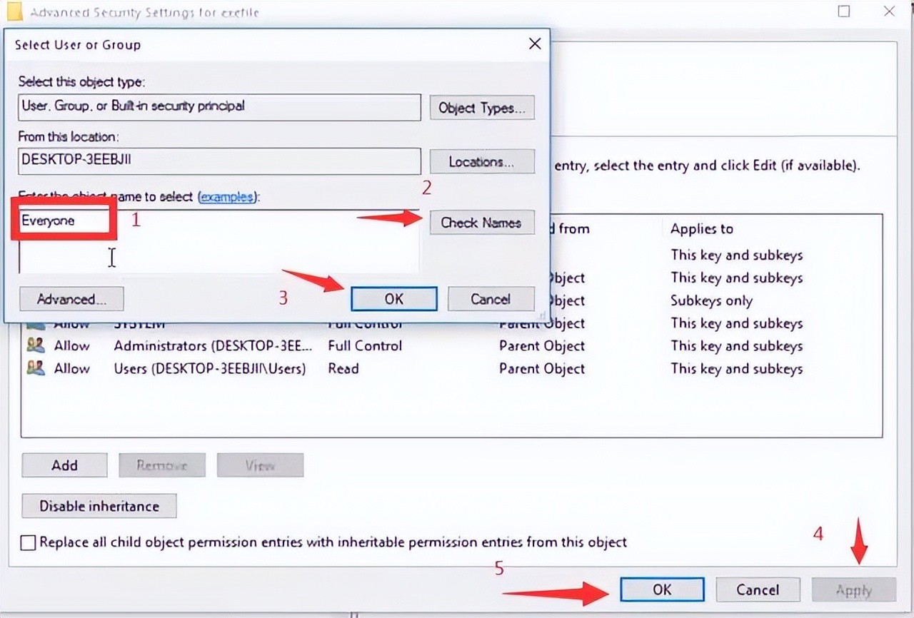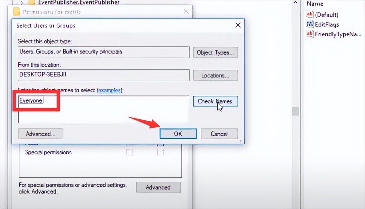再次输入要选择的对象名称,在选项对话框中输入“Everyone”之后点击确定,再点击“应用(Apply)”和确定。