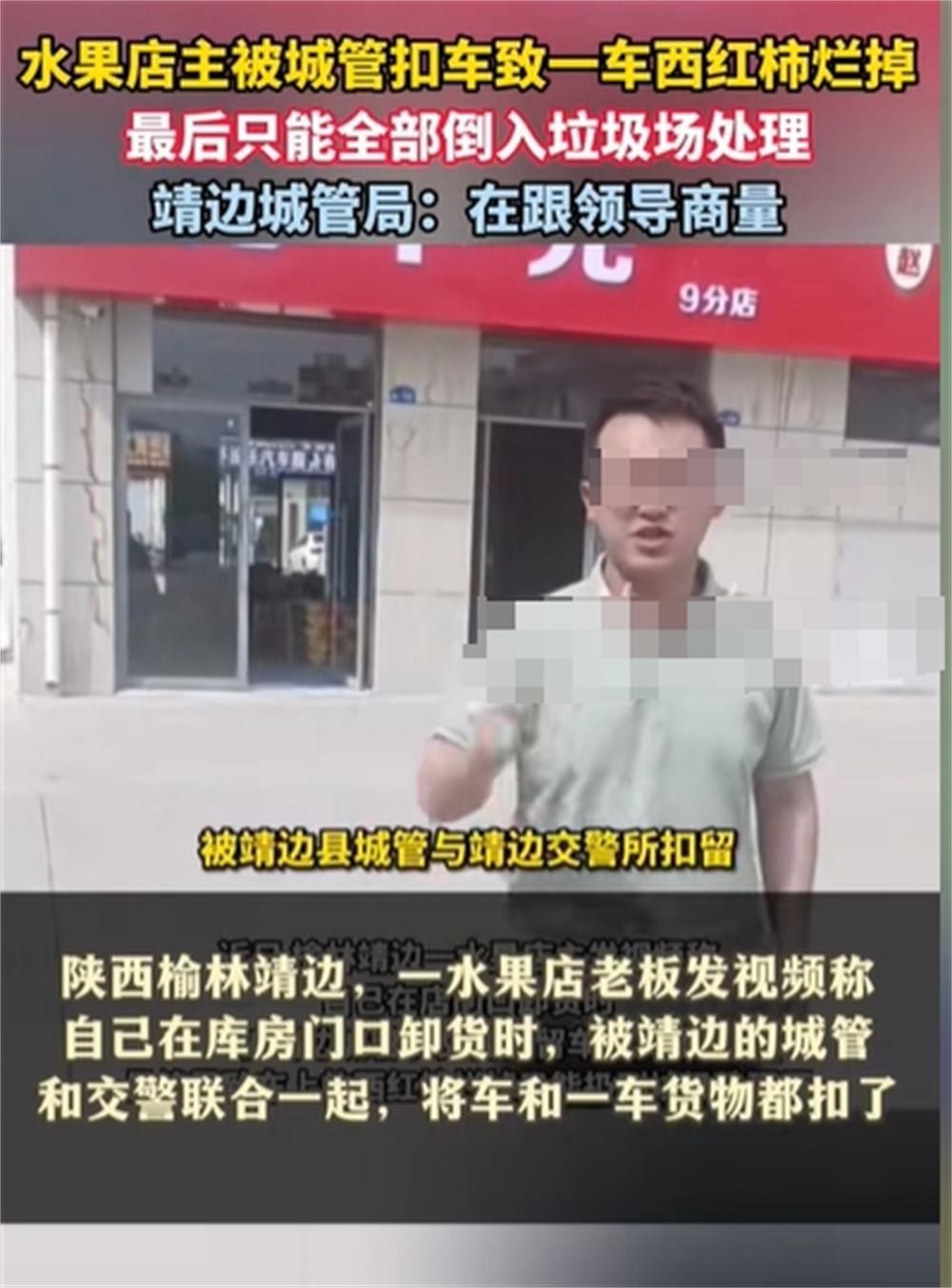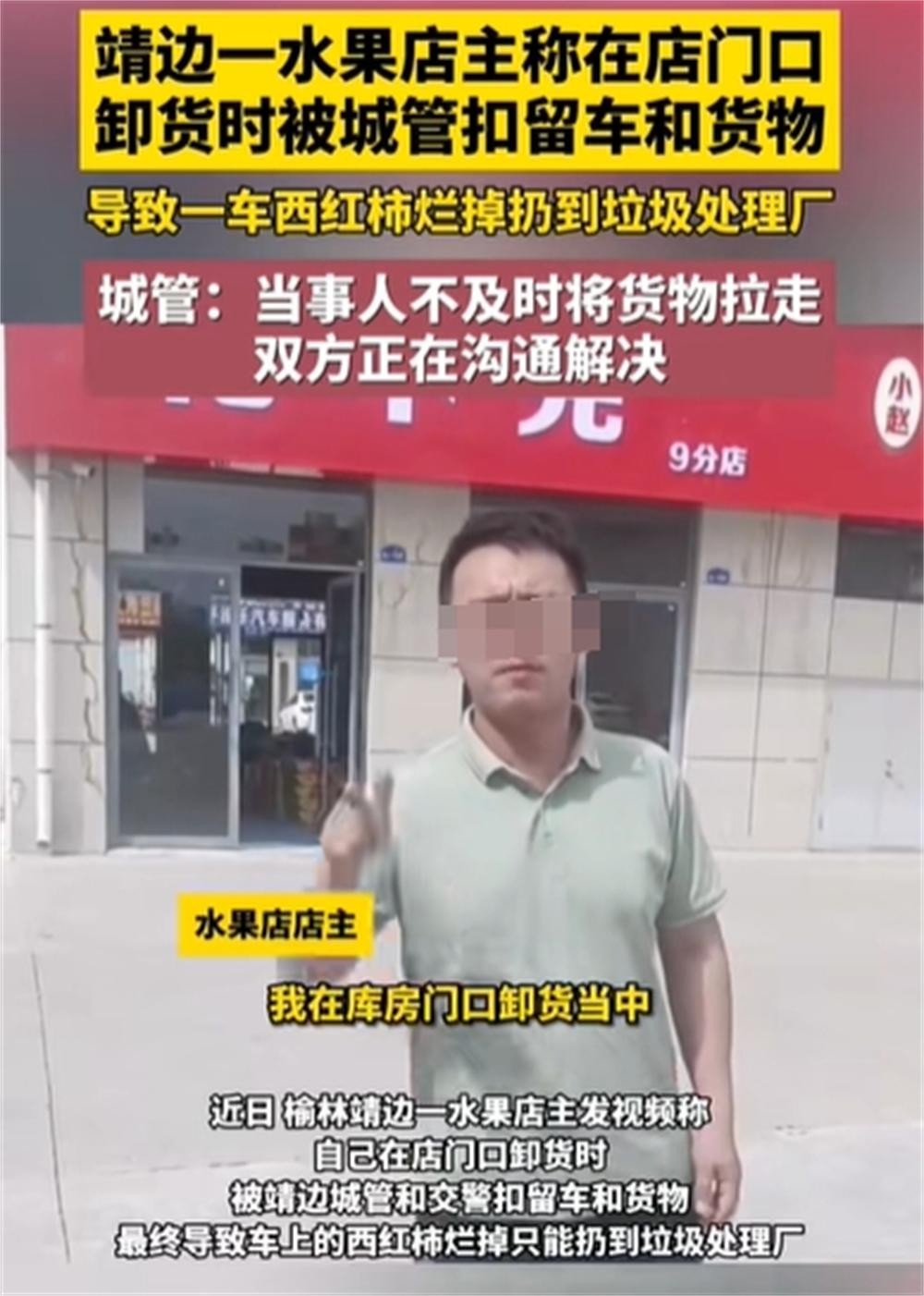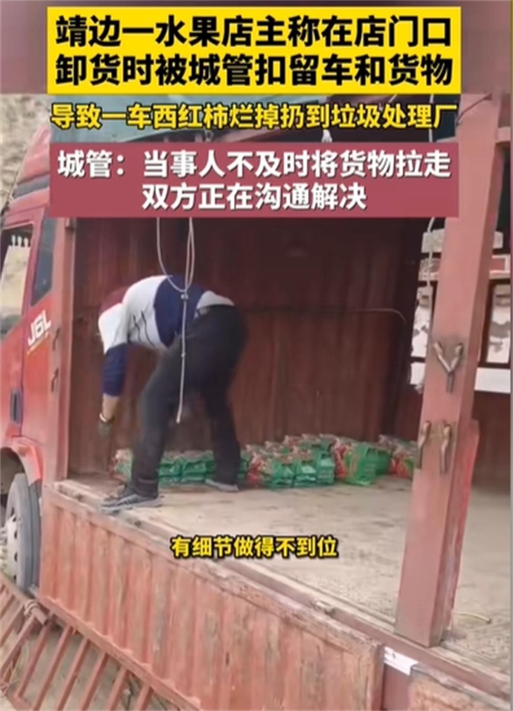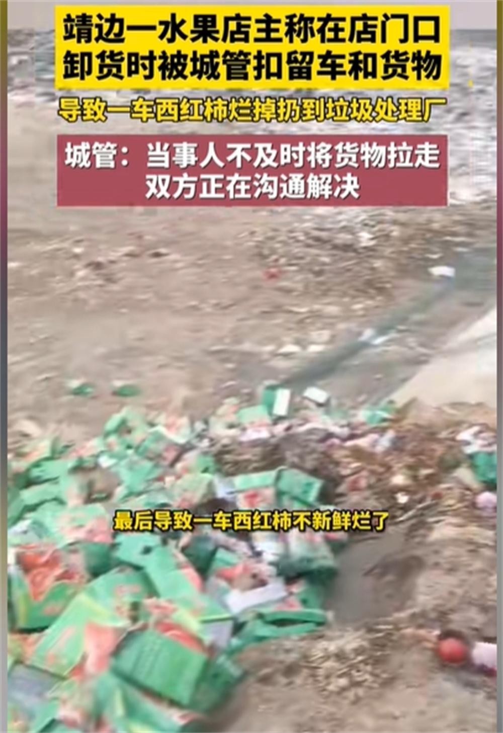 一名陕西榆林靖边县的水果店主,不幸经历了他的一车西红柿因为被城管单位扣押而无奈倒置垃圾场的悲剧。
