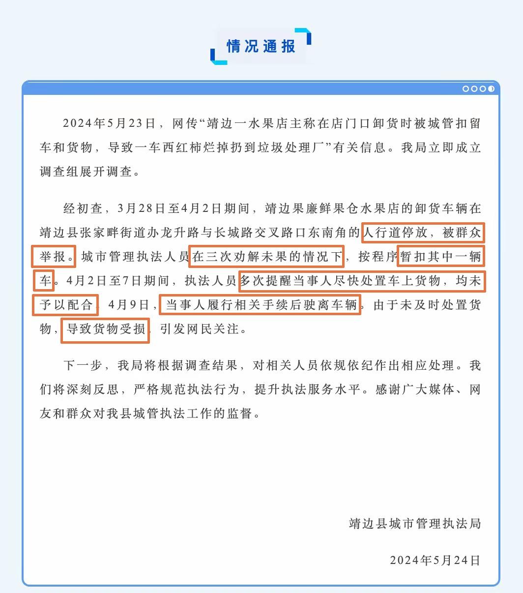 据媒体5月24日报道,自这一事件以来,过去的五十多天里,事情仍旧没有得到解决。靖边县城管局已经着手进行调查,承认在执法过程中存在问题。