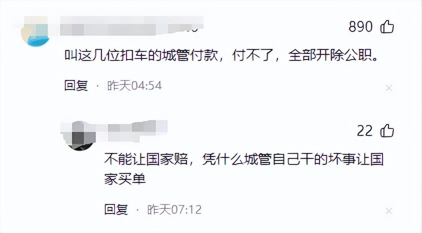 叫这几位扣车的城管付款,付不了,全部开除公职。