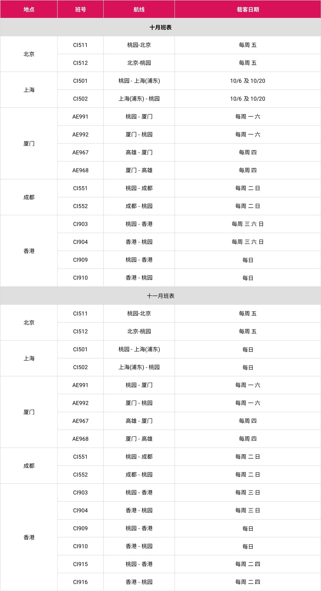 航班动态丨中华航空、长荣航空10月、11月航班营运信息