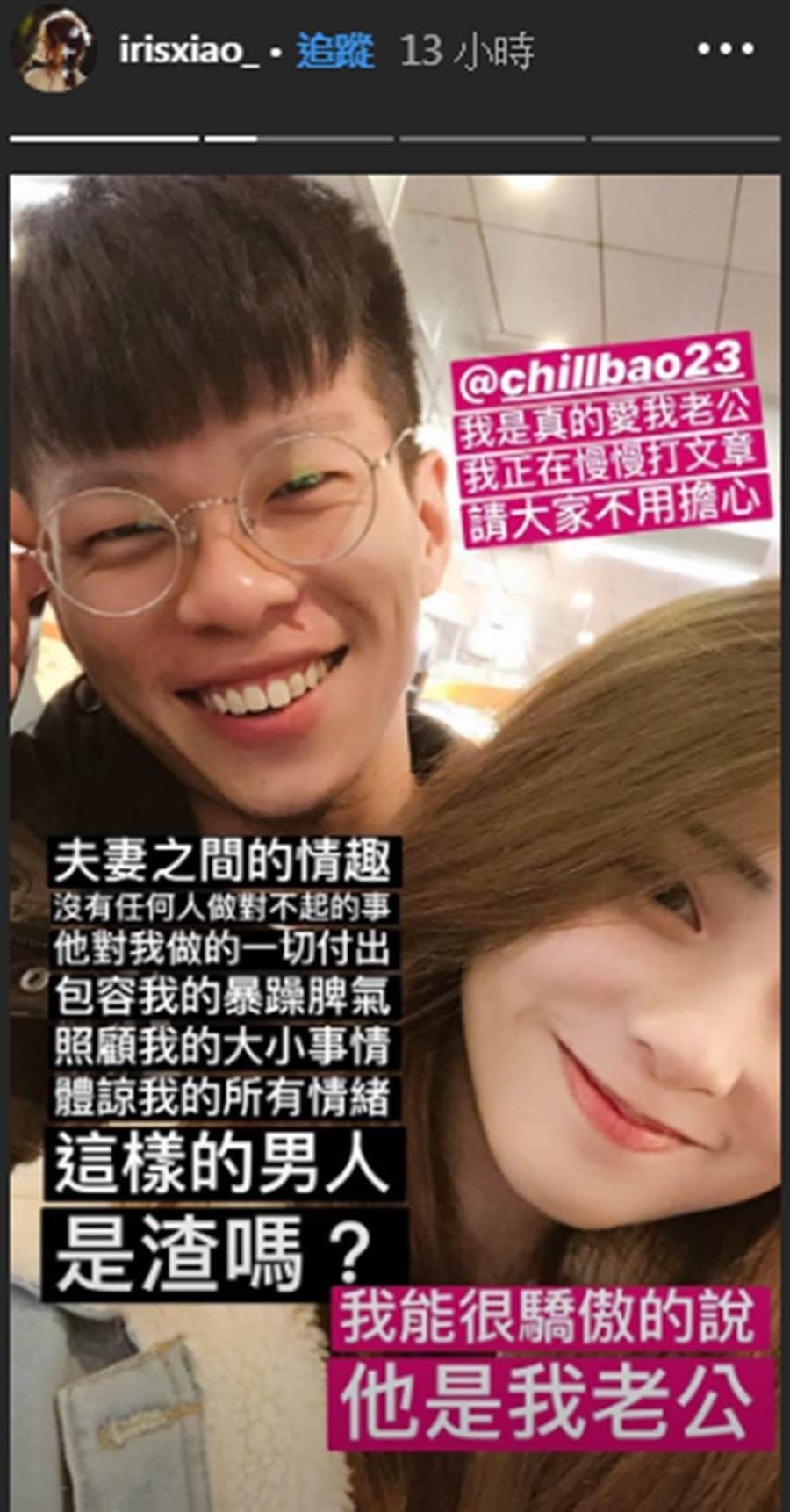 有网友在PTT八卦板爆料,表示闪亮亮和黄包包虽然才交往半年,但其实早就已经登记结婚,老早就是夫妻关系,此外对照闪亮亮力挺黄包包的PO文,只见她写道:「都是夫妻间的情趣,没有任何人做对不起的事」,接着更大方像外界宣告:「我能很骄傲的说他是我老公」,字句中提到「夫妻」、「老公」等关键字,也让两人的关系更让外界好奇。