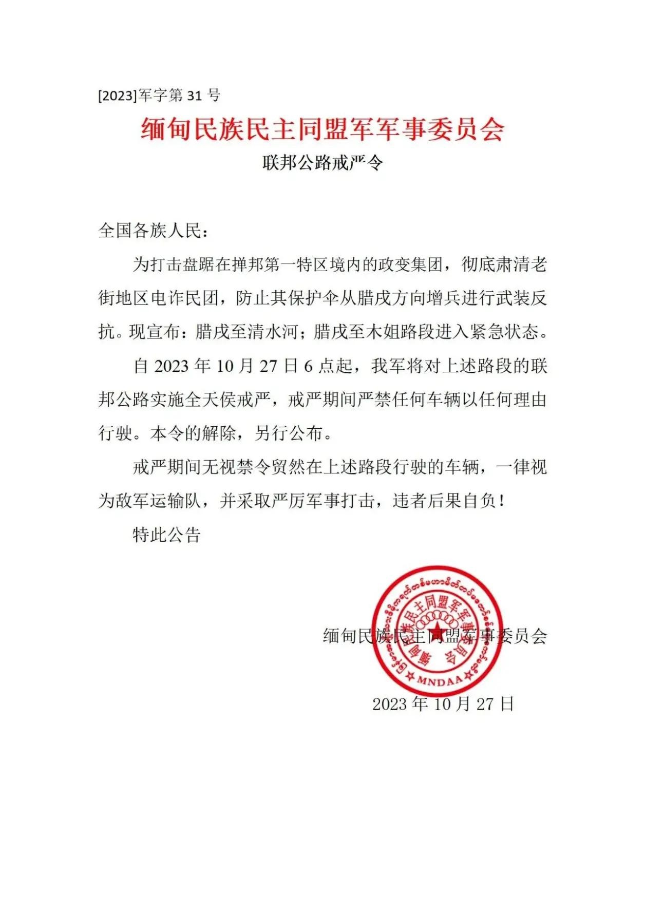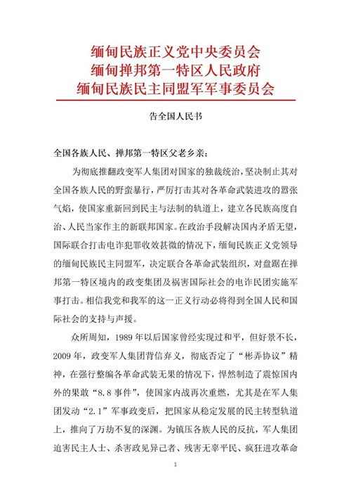 再之后就是今天,2023年10月27日。同盟军以“党政军”的名义发了一个“告全国人民书”的红头文件,他们依旧还使用着“一特”的名字。大体内容意思是,借着帮助中国打击电诈的名义,要对缅军和白所成集团动武,准备把他们彻底赶出果敢。