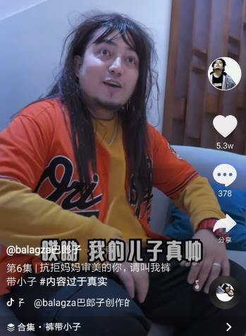 在这些短视频中,巴郎子经常一人分饰多角,通过呈现令人意想不到的反差,起到爆笑解忧的效果。比如最为粉丝们津津乐道的“裤带小子”系列,巴郎子以一个倒霉孩子的形象出现,每天不吃老妈的一顿“冷冻裤带面”就浑身不自在。而视频中的老妈也是由巴郎子本人扮演,把为(一)了(言)孩(不)子(合)操(就)碎(修)心(理)的老母亲的形象展现得淋漓尽致。