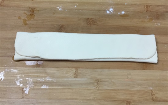 4、面板上撒上干面粉,取出面放在面板上,用手揉一揉排出空气。揉成的小长形,用擀面杖擀成长方形的,大约5mm的饼。再用小刷子均匀抹上油,少撒一丢丢盐,有油有盐增加点味道。再撒上一点点干面粉防止油溢出。然后折叠一层,再对折一共三层,用手按一按。
