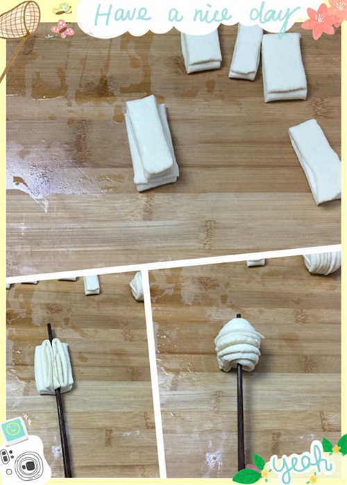 6、另一种做法,把相同宽窄的两个叠放在一起,用筷子也是顺着压,一压到底,把筷子抽出。两只手捏住两端,向不同相反的方向拧。拧出纹路,两端往中间对折,捏在一起,另一种生坯也做好了。