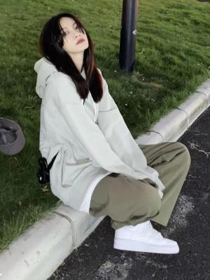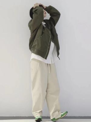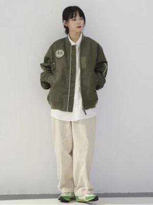 军绿色的飞行夹克复古少年气,下身搭配卡其色工装裤,秋冬少年感立马有了,内搭白衬衫的组合显得更加清新有活力,真的很符合校园感的无性别穿搭~