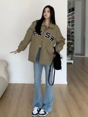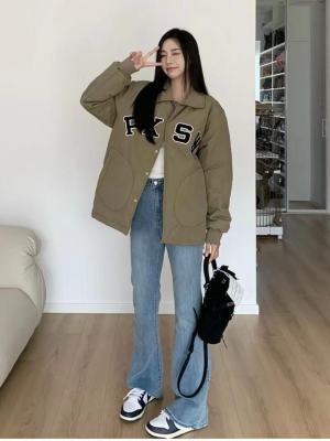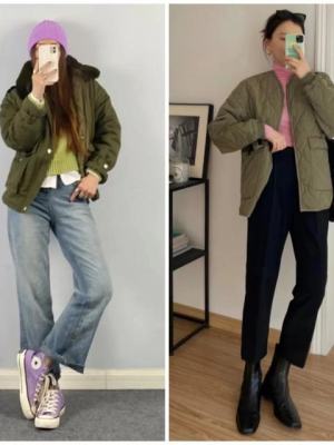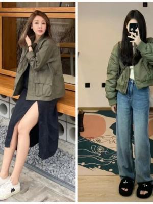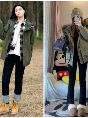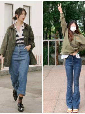 饱和度低的军绿色棉服上身显白又洋气,下半身搭蓝色喇叭牛仔裤真的是绝配,秋冬穿也不会冷,又时髦又保暖~