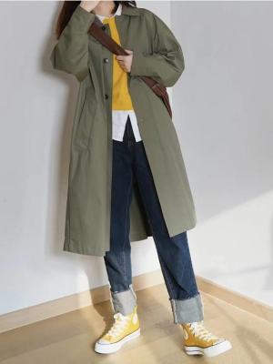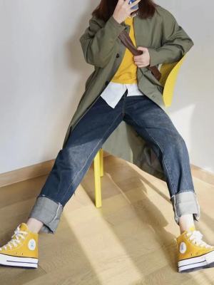 外套是日常好穿的军绿色风衣,内搭黄色针织毛衣+白色衬衫增加层次感,下半身搭配深蓝色牛仔裤,黄色帆布鞋还能与内搭和包包呼应~