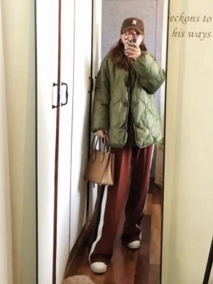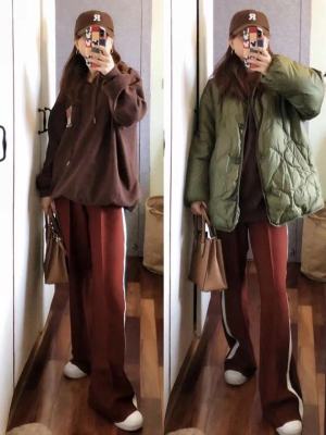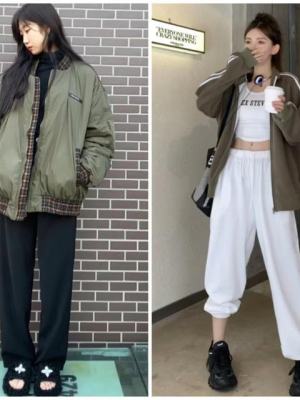 焦糖色在秋冬绝对是妥妥的主打色,卫衣、校服裤、帽子都是一个色系,整套搭配暖得不要不要的;军绿色短款羽绒服+焦糖色校服裤搭配非常合适~