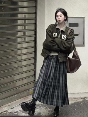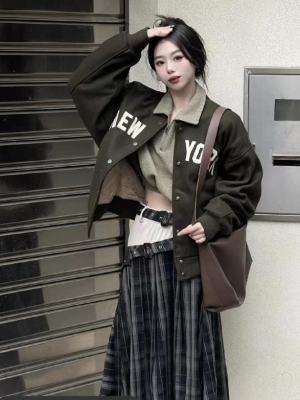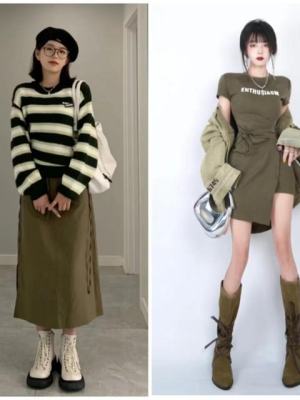军绿色和咖色锁住,太是秋冬的感觉,小个子这样穿太友好了,复古夹克搭配短上衣和高腰裙,显得比例很好,复古美式学姐的look~