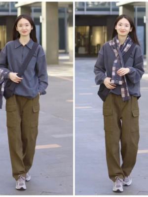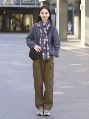 中性风的灰色上衣搭配军绿色工装裤有点酷,配格纹围巾增加保暖,冬季也可以把这套当作内搭,脱下外套在室内也好看~