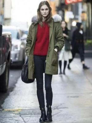 军绿色派克大衣不是很衬肤色,颜色感也不够强,所以一定要注意颜色的搭配。军绿色内搭红色毛衣做撞色,颜色对比强烈,色彩也比较和谐~