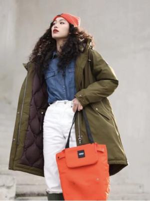 look2 军绿色羽绒服+亮橙色帽子/亮橙色包包