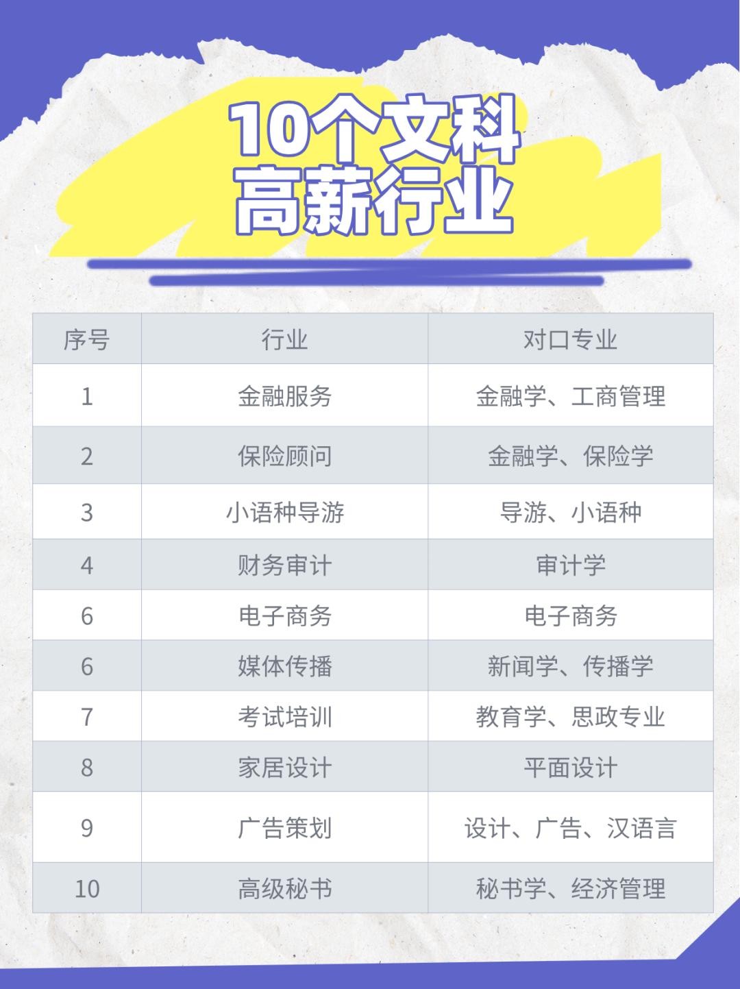 除了这5个行业以外,排在第10名的高级秘书,也是文科高薪的岗位之一,它的对口专业主要以秘书学和经济管理学为主。