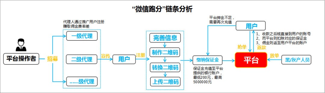 平台要求缴纳保证金才能参与,保证金充值至平台提供的银行账户,最低200元,最高500万元,如果不返还或出现其他争议,会存在资金损失风险。由于“跑分”的前提是缴纳押金、保证金,高额的押金让“跑分”成为高风险的活动,对方不仅是陌生人,还可能是想“空手套白狼”的代理,或是黑灰产的从业人员。因此,一旦遇到不靠谱的上家,这钱就很可能打水漂。