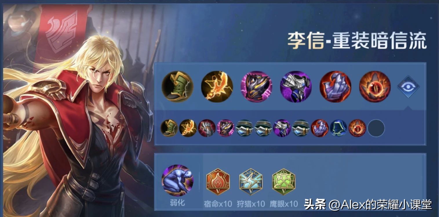 新版李信走双修流,出装上要有物理攻击和物理穿透保证光信的伤害,还要有攻速和坦度来保障暗信的强度。