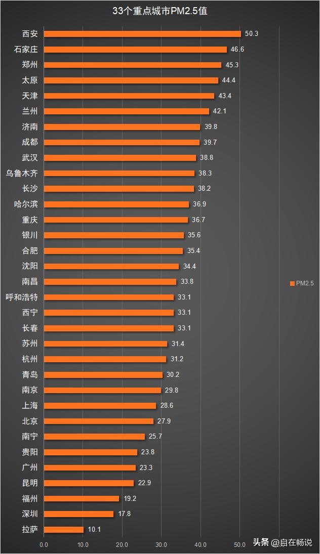 33个重点城市中,PM2.5指数最低是拉萨,全年仅10.1;其次是深圳,全年PM2.5为17.8;第三是福州,全年PM2.5为19.2;第四是昆明,全年PM2.5为22.9;第五是广州,全年PM2.5为23.3.