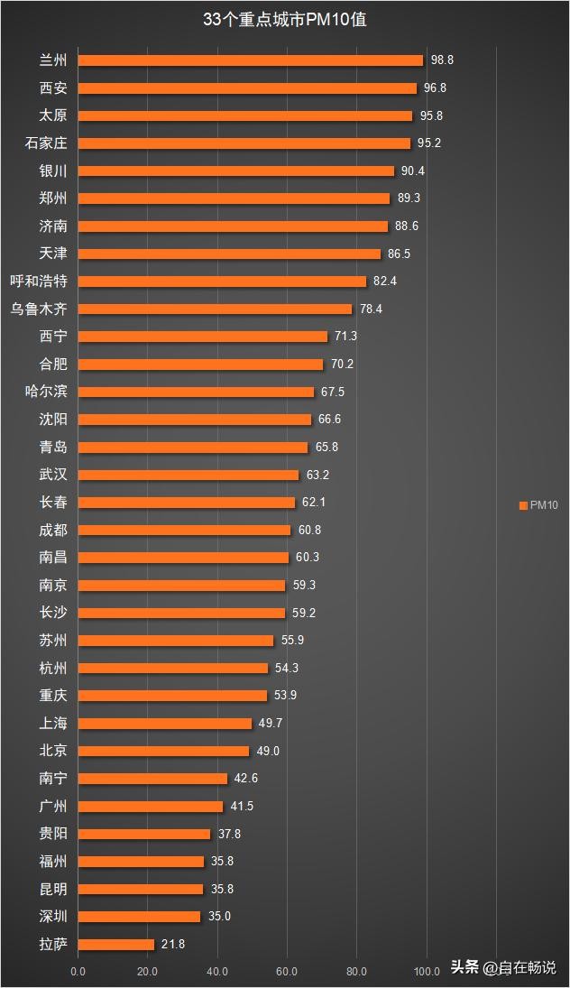 33个重点城市中,PM10指数最低同样是拉萨,全年仅21.8;其次是深圳,全年PM10为35;第三是昆明,全年PM10为35.8;第四是福州,全年PM10为35.8;第五是贵阳,全年PM10为37.8。