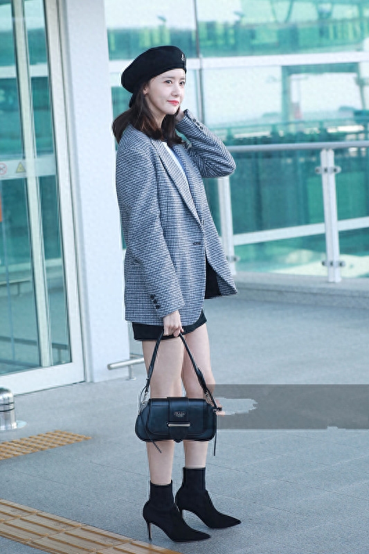 贝雷帽是蛮有气质的一个单品,而且对女生的脸型不太挑剔,尤其当它与衣服风格统一时,能为秋冬造型添加时髦的细节感。林允儿的黑色贝雷帽便是与裤装及靴子相呼应,外披一件格纹的大一号西装,几乎营造出了“下半身失踪”的潮流街头范,手提一个黑色包包很有职场干练女性的范儿。