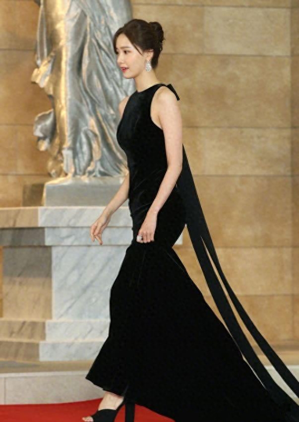 先来看看林允儿的整体打扮吧,在正式场合的发型往往要严肃而大方,一个棕色的盘发就很适合了,俩小拨划过脸颊的刘海清新减龄呢,挑选一条修身的礼服出席活动必然优雅大方,质感的丝绒材质是高贵形象的衬托,脚踩一双黑色粗跟的恨天高。