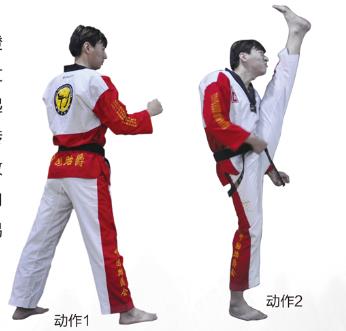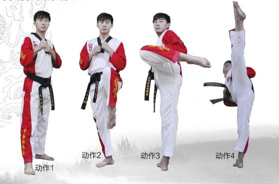 在标准的准备姿势下,后腿小腿正面提膝夹紧,蹦脚背,支撑脚旋转90度,支撑腿伸直,身体正面向前,在此基础上迅速弹收小腿,后放下。