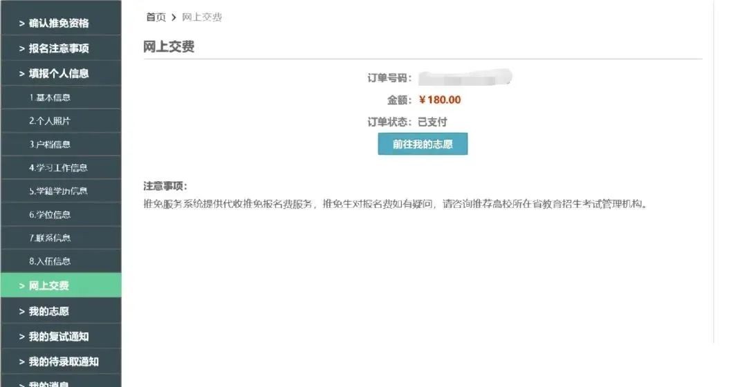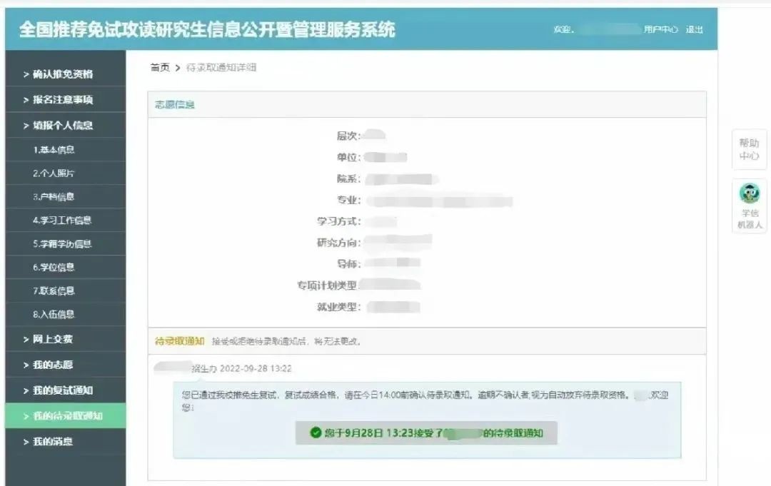 请推免生认真了解系统各项提示信息,及时登录系统查看招生单位发送的复试通知和待录取通知,并与招生单位保持密切联系。