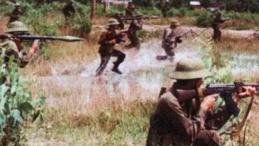 等到13日,友军都撤的差不多了,150师也领到了撤向广西的命令。于是,150师便深入山区,依山分兵走小路撤退。这其中,该师的448团2营在班英一带的山区经过一处水坝和山头撤退时,突然遭遇了附近埋伏在稻田和山间密林的越军袭击。