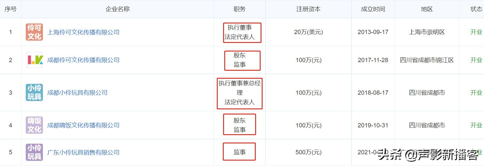 在与小伶玩具品牌相关的玩具销售公司和文化传播公司中,汪钰伶主要是担任股东监事和执行董事及法定代表人职务,职位很高。