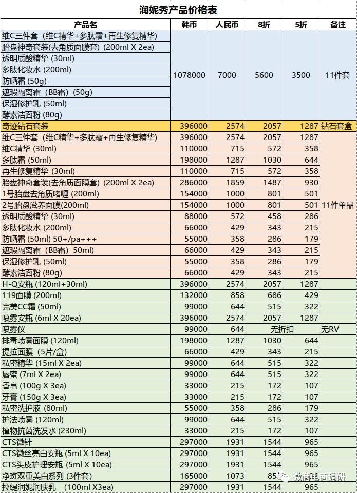 据了解,润妮秀的代理大致分为高级会员(也叫合伙人)、经理、总监、首席四个级别,另外还有一个会员级别,可以免费注册,当会员推荐其他人消费产品时会有相应的提成,然后才能升级到高级会员,正式进入代理的队伍中。只要成为会员,就能享受公司产品终身最低折扣5折,任何级别代理都是一样的折扣,代理的利润主要分为主动收入和被动收入两部分,其中主动收入有推荐奖,被动收入有后援奖、2线奖、3线奖、国际奖、领导力奖和国际领导力奖。具体的产品价格表如下图: