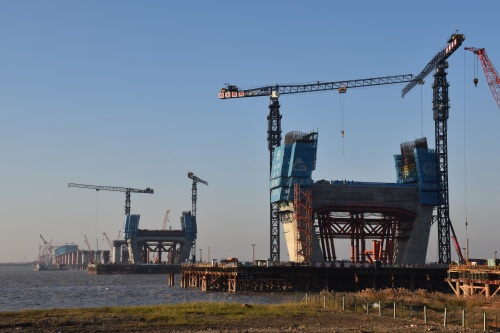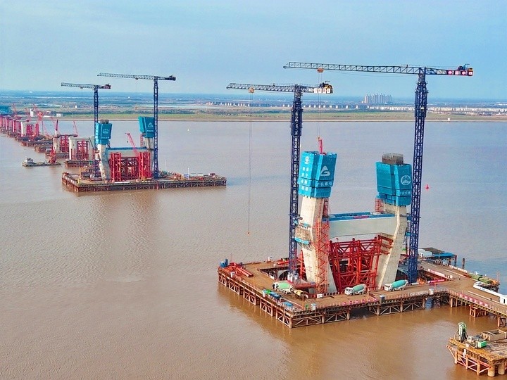 “北航道桥南、北主塔上塔柱均已安装过半;南、北锚碇也已露出地面,锚体施工全面展开;南、北引桥均已完成大部分下部结构施工,现已开启上部结构施工。”省交建局张靖皋长江大桥建设指挥部现场指挥长李洪涛说,“接下来将全力以赴完成各项目标任务,力争项目早日建成。”