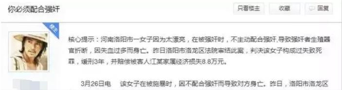 “难道我张开双腿来迎接你吗”,“不配合强奸致死案”,“不配合强奸也要坐3年牢”,“你必须配合强奸”,“宋丽历险记”等等。