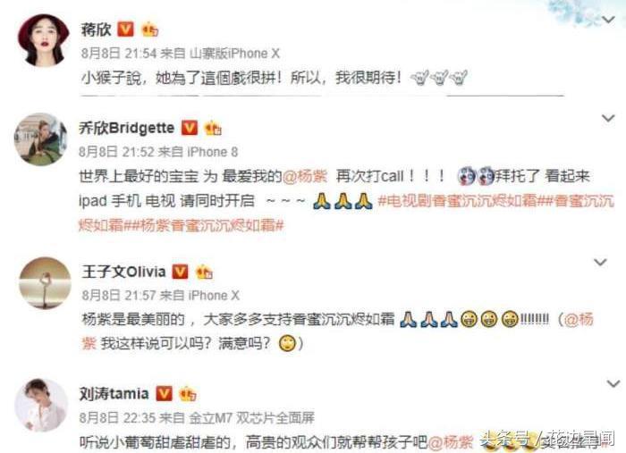 这部剧刚出来不久,打开微博,扑面而来就是《香蜜》的宣传。作为主演之一的杨紫就为了这部剧操碎了心啊,不光是前期为了拍戏瘦身18斤,后期更是使出浑身解数,拉来了一大票娱乐圈好友帮自己宣传。对于小葡萄的要求,这些好友:安排上啦!