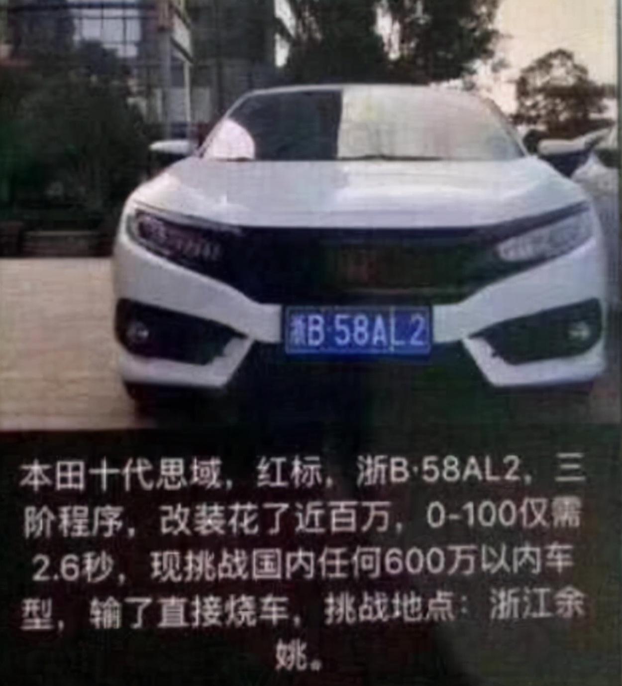 他甚至在网上放出了战书,将自己汽车的车牌号和挑战地点都定了下来,打算用他这辆花了100万改装的思域迎接各路挑战。