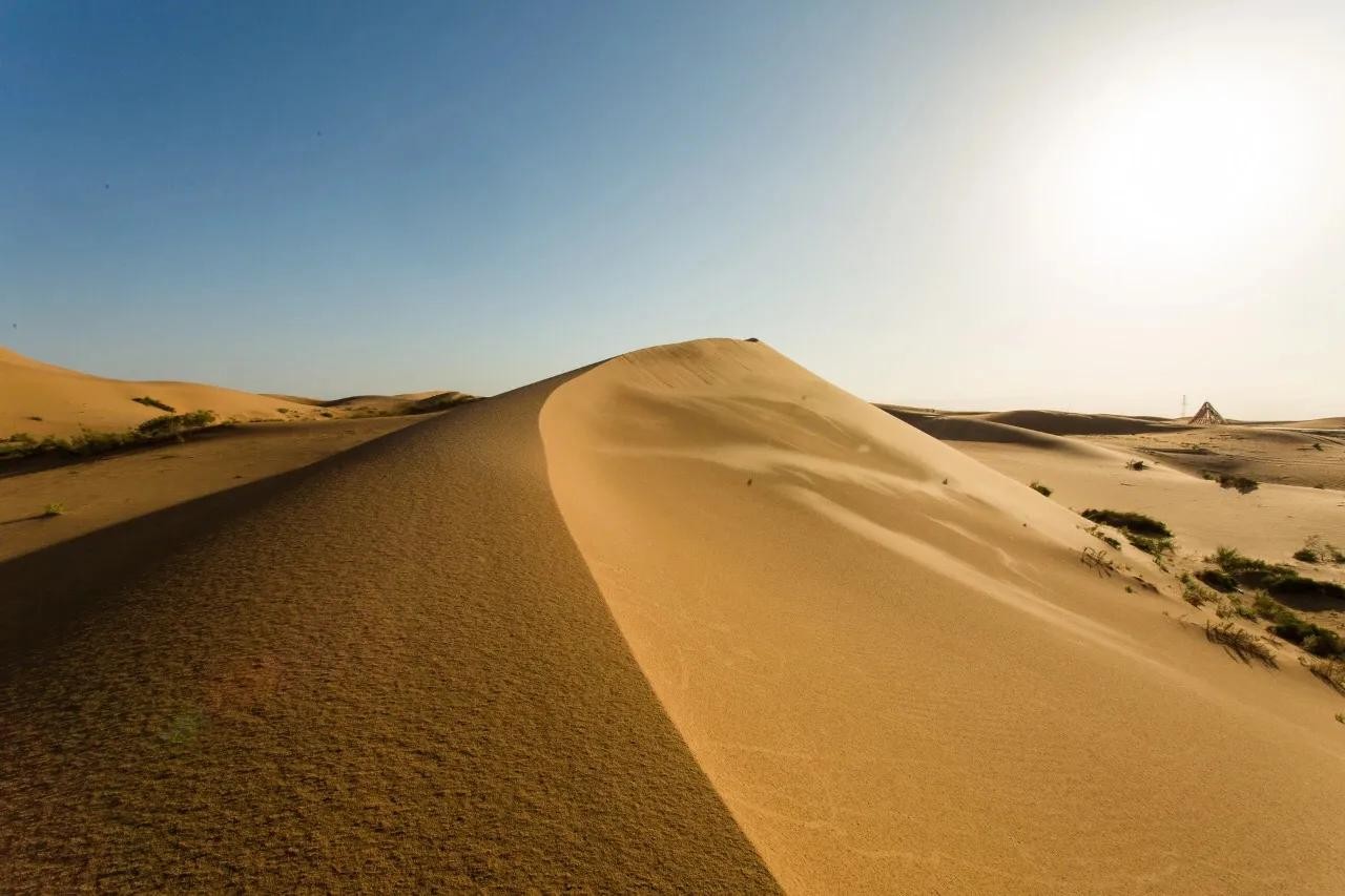 腾格里虽然不是最大的沙漠,但其沙峰壮阔宏大,沙粒细微软滑,颜色金黄闪亮,别具特色。