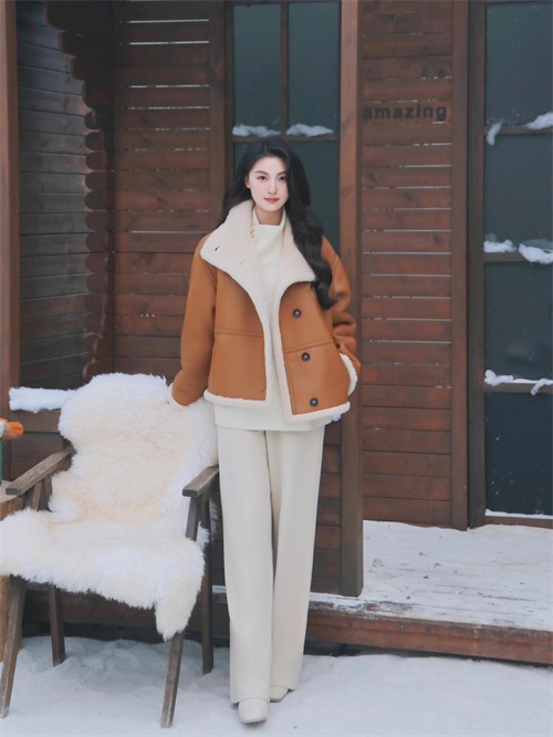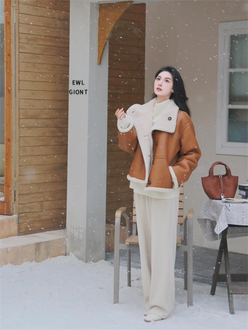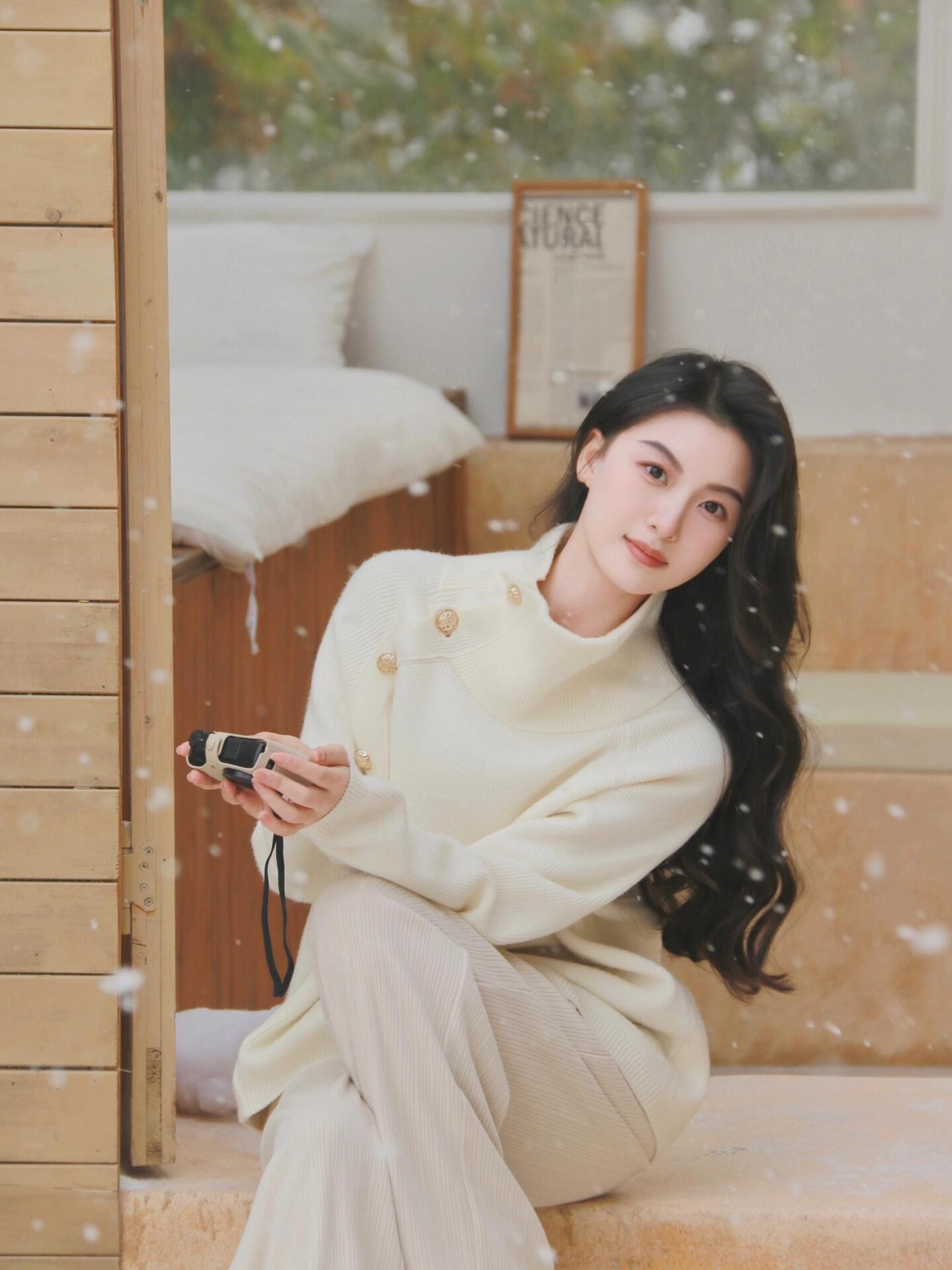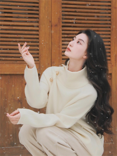 如果是雪天拍照,我们可以选择侧身站立的方式,让模特微微倾斜身体,侧身站立,抬头看向空中飘动的雪花,在这种机位拍摄,模特更显瘦挺拔,此外,抬头的动作也能突出立体好看的五官轮廓,简约又实用。