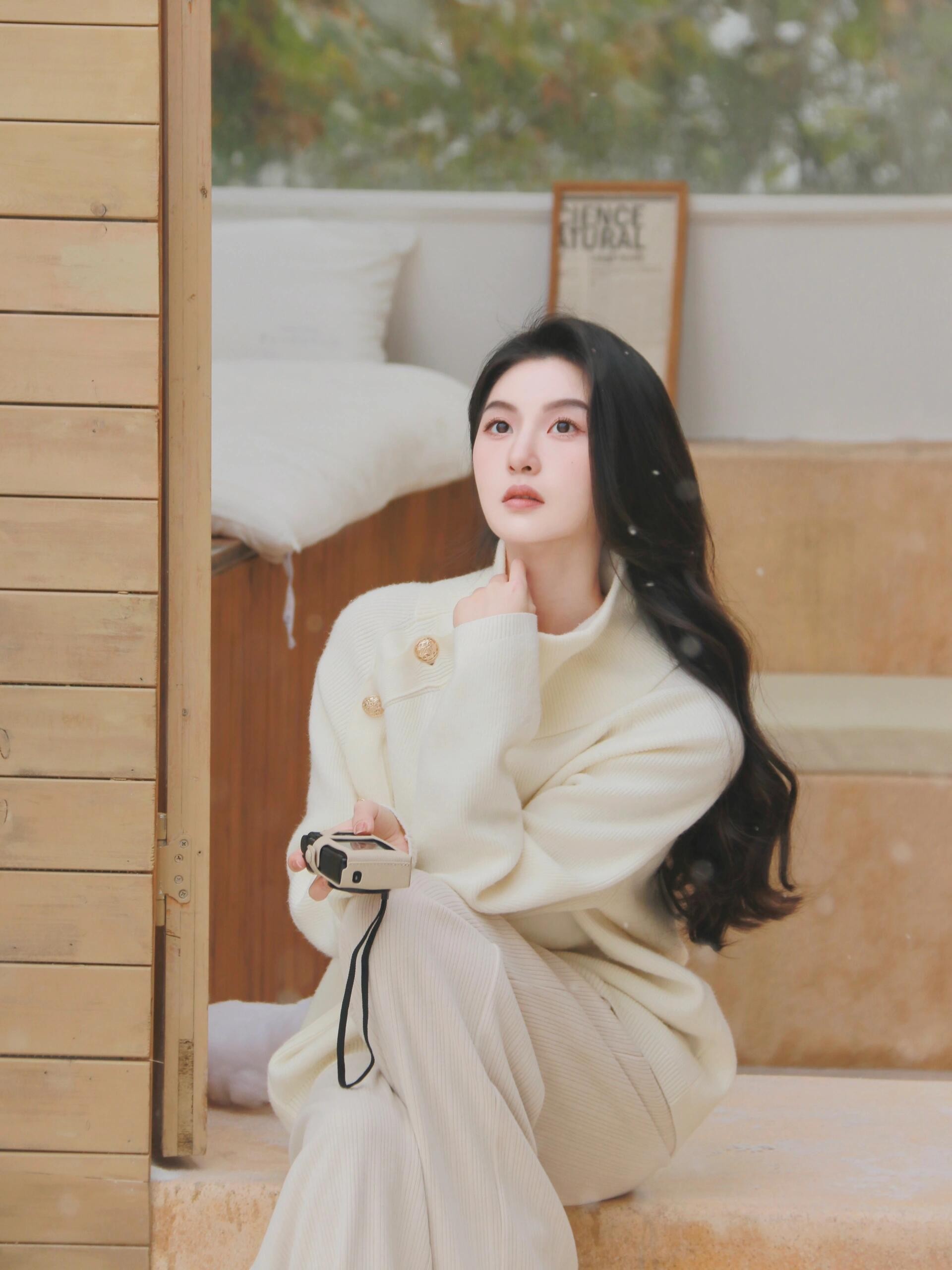 不看镜头的姿势能更好捕捉模特自然好看的一面,以坐姿拍摄的时候,我们可以一手拿相机,另外一手撑着膝盖,手指轻点下巴,将观众的视线引导到模特的脸部上,再微微抬头,仰望天空,呈现一种思考的状态,这样的姿势,更加唯美文艺,拍出优雅颈部线条的同时,也能避免拍到双下巴。