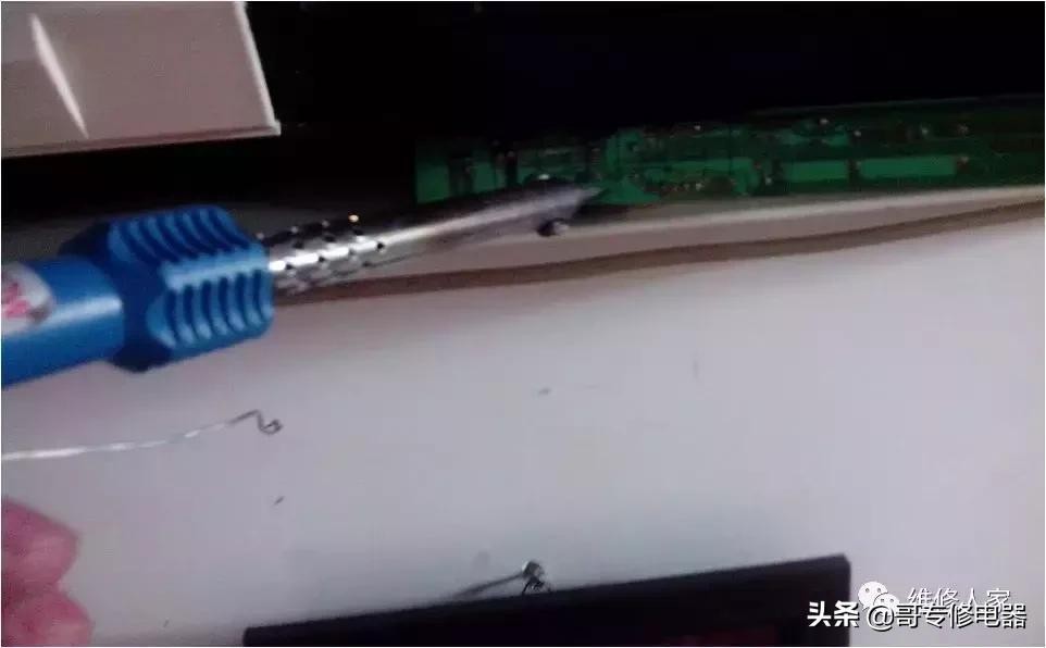 第六步是拆除故障接收器原件,用电烙铁烫掉在电路板背面的接收器原件脚上的锡点。如果有吸枪就吸掉融化的锡点。没有的话要在锡点融化时迅速拔出该元件。要三个原件脚同时被融化,拔出时要快。可以带手套,以免烫伤手指。