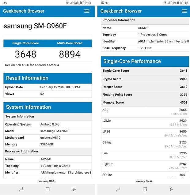 根据此次曝光的三星Exynos 9810在Geekbench平台上的跑分截图看,三星Exynos 9810处理器单核心成绩达到了3468分,多核成绩更是高达8894分,而根据截图显示,此次用于跑分测试的机型应该是欧版的三星S9,而且这款三星S9的运行内存只有4GB,运行的系统是安卓8.0,而前一日曝光的高通骁龙845在相同跑分平台上用于测试的工程机的运行内存则达到了8GB。