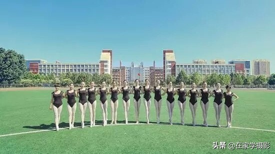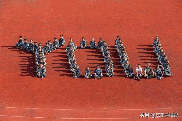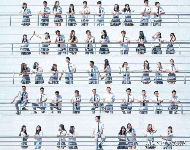 每个学校都有看台,这个地方是拍摄及调整的好地方,将总人数计算好,分成几等份,这要考虑看台的层数,一般情况下不要超过五排,不然看起来非常松散,控制在3-5排是最合适的。