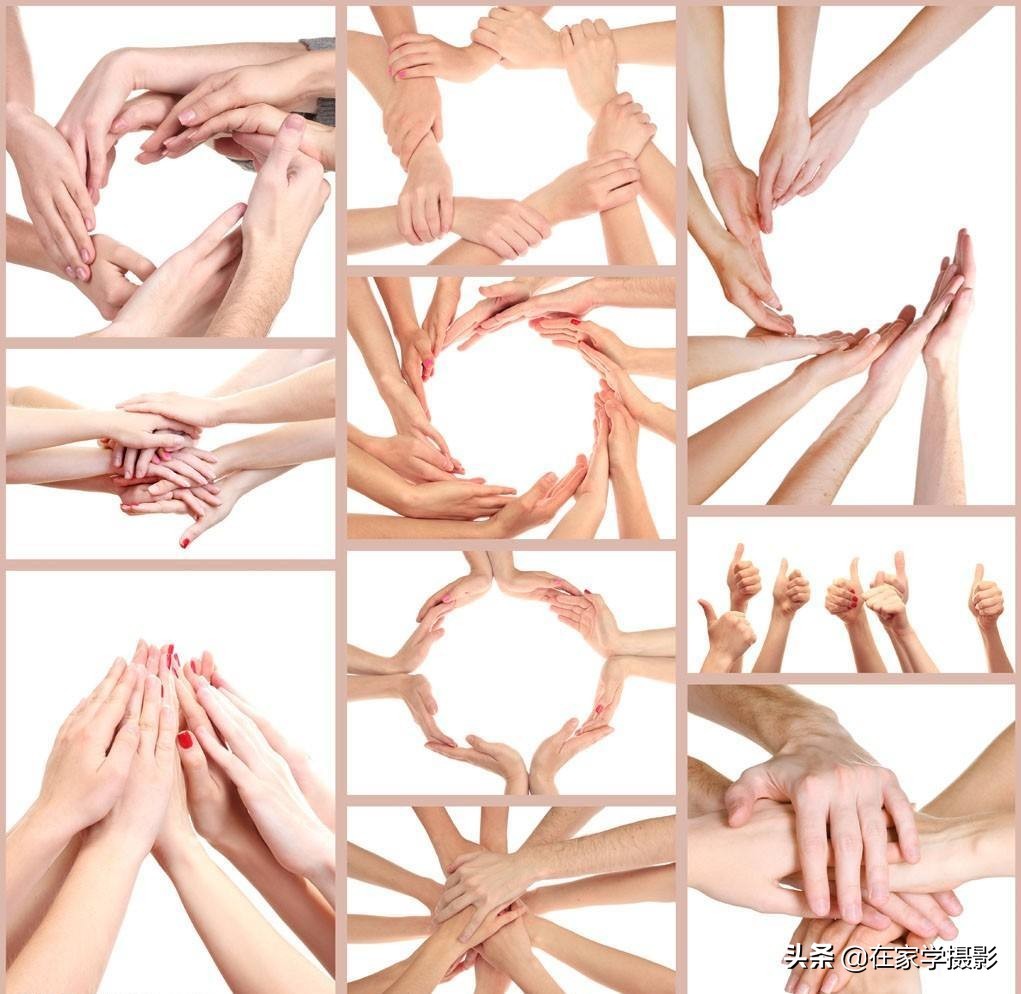 拍摄集体照除了要拍摄人物正面以外,拍摄每个人的手也是非常有意义的,集体代表着团结与合作,试着做出下面的动作,凝聚成一股力量,象征了你们是一个不可分割的集体,这种集体照有机会了一定要试试,背景选择天蓝或者草地都可以。