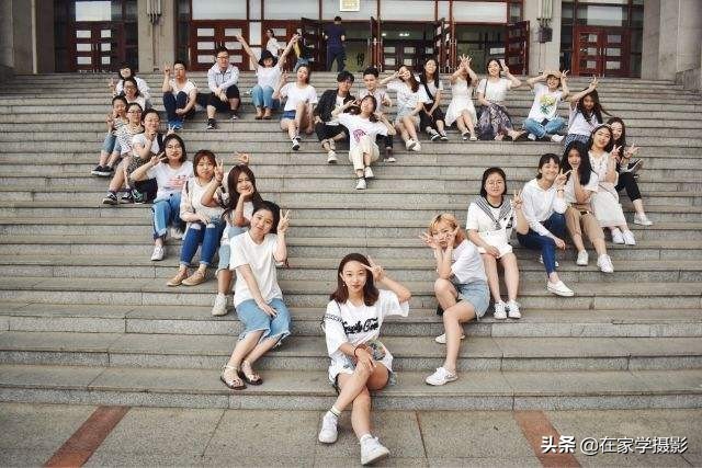 教学楼门前一般都是台阶式,同学多的聚会就可以用到心形的姿势,越密集越好,这个姿势除了平拍以外,还可以用俯视的角度来拍摄,注意调整心形的姿势,避免走形严重。