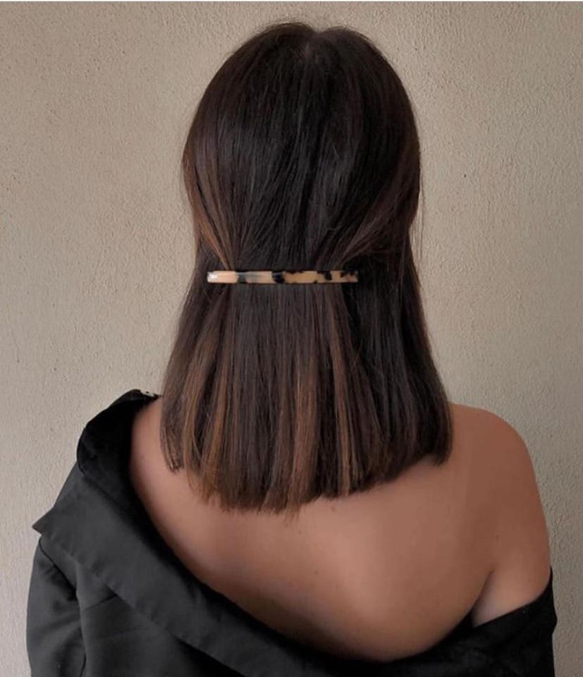 两侧挑起在脑后固定的发型很常见,但换上一个复古式的发夹就会为发型增加更精致的感觉。修剪整齐的中短发,整齐的拢在脑后,简单的横线发夹加上琥珀感图案,带着古典的优雅。