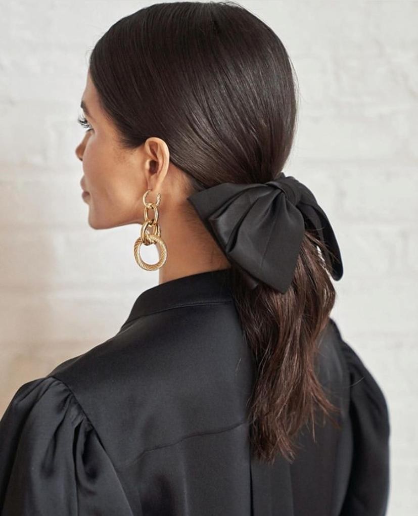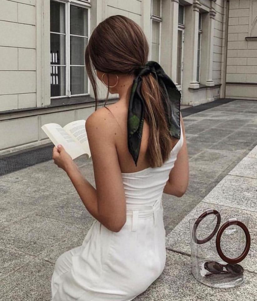 黑色调是尝试丝巾融入发型的入门方式,与生俱来的优雅感,通过造型或绑带完成,搭配衬衫或吊带长裙都很好看。