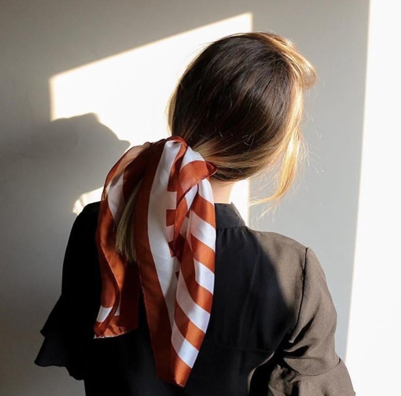 长款丝巾绑在发尾,剩下的部分就自然垂落,利用丝巾的面料营造有质感的垂坠,还能弥补头发过短时期的尴尬,再加上很好操作的绑发方式,手残星人也能轻松驾驭。